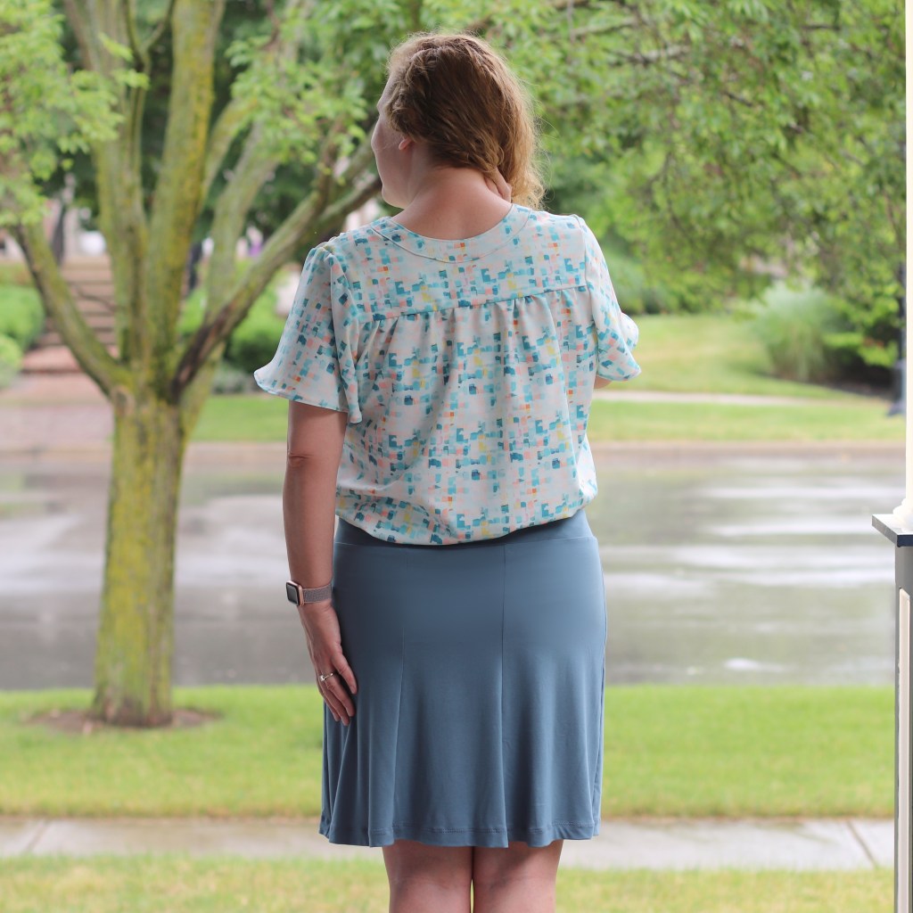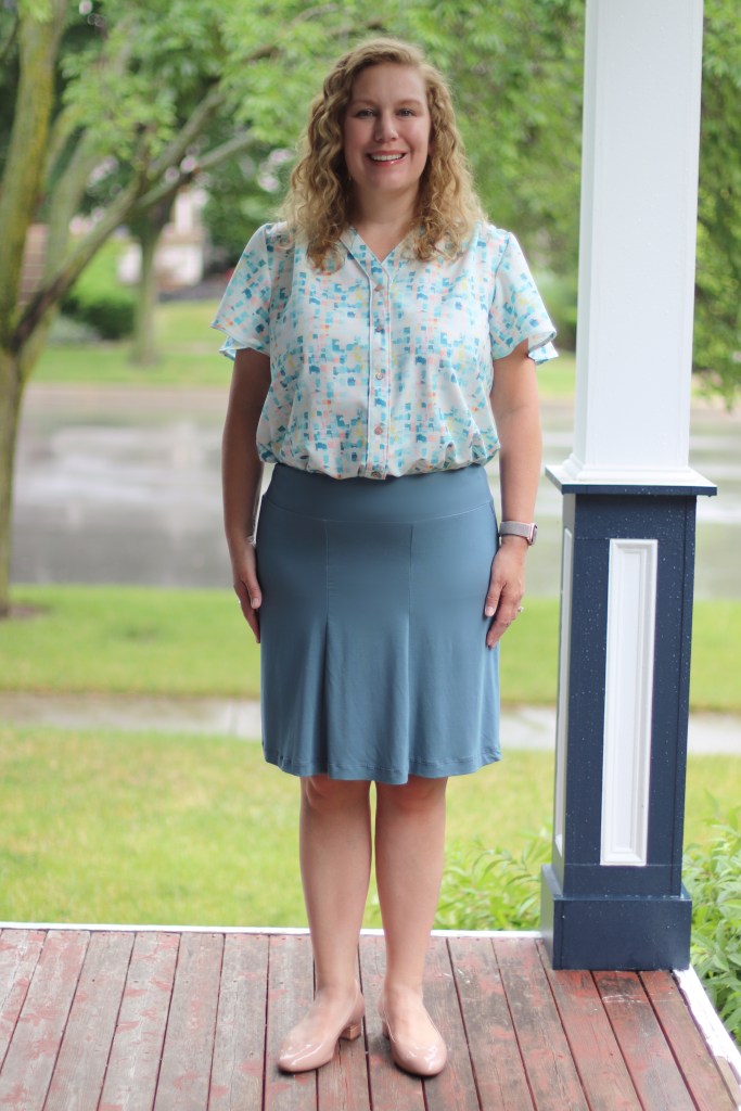 I’m also thankful to my husband who took these photos for me. There was a downpour once we got started, but he stuck with it. He is a great support to me. I used the Raspberry Creek Fabrics Sea Blue Modal Spandex Jersey Knit Fabric for this knee length version of the skirt. I made a matching Ballad Blouse with Raspberry Creek Fabrics Tonal Teal Blue Coral and Yellow Abstract Square Print Stretch Crepe. I used some beautiful antique buttons that I had stashed.