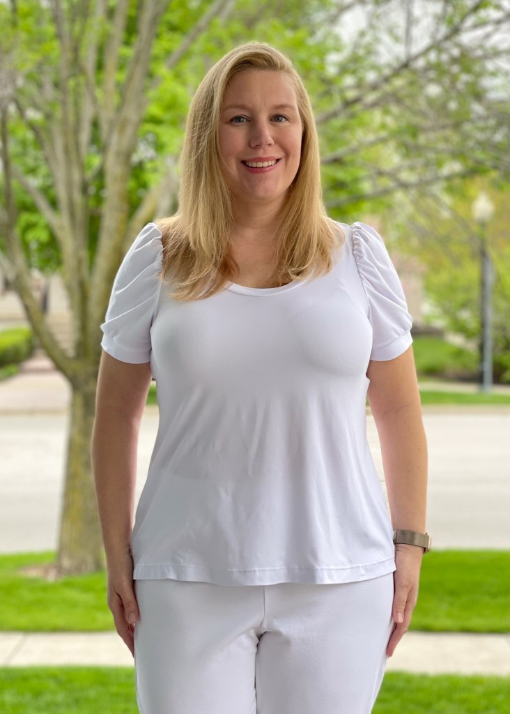 I decided to make a Classic Tee with Arlington Puff Sleeves and a scoop neckline. I demonstrated how to make this on a Love Notions blog post on Swapping Sleeves, if you are interested in trying it. I just used solid white double brushed poly and loved it so much more than I anticipated.