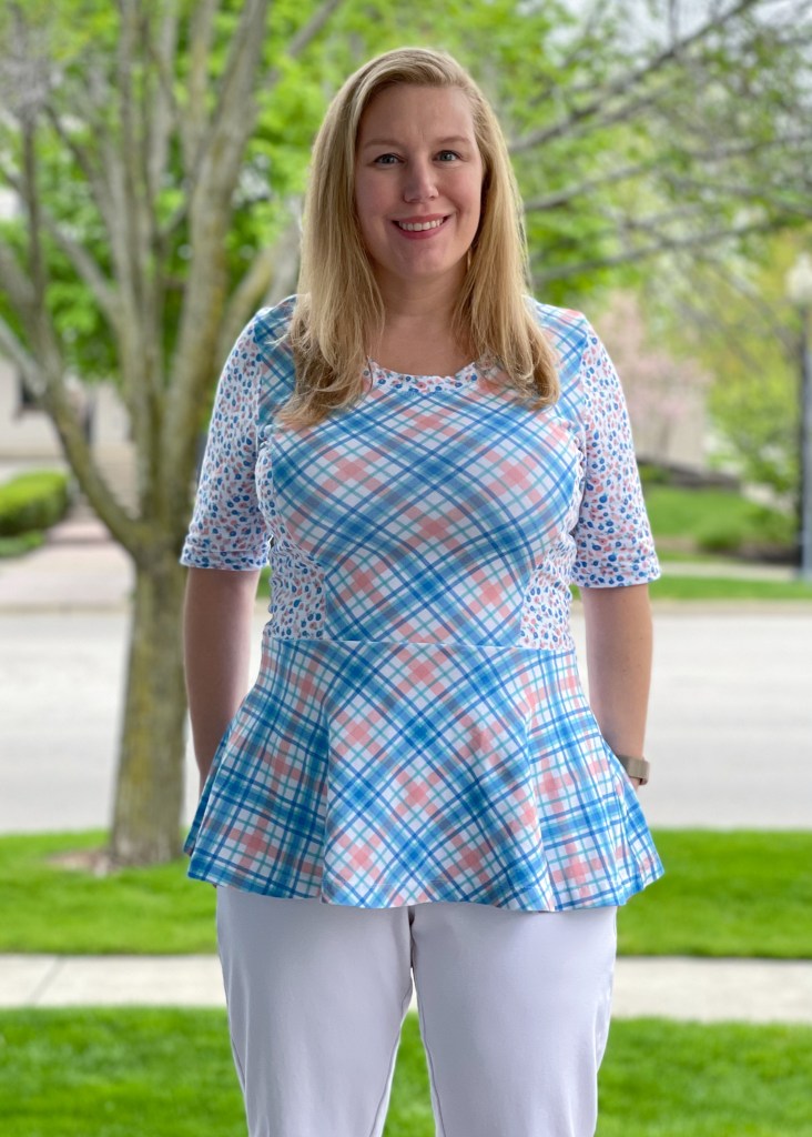 I used a Diagonal Plaid Print Fabric and Simple Dot Floral Print Fabric from the same Bright Spring fabric collection as my Fraser cardigan above. I really love it with this top and will wear this outfit tons to work.