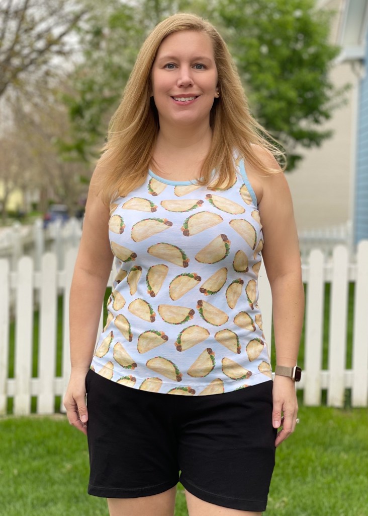 I used this as the perfect opportunity to make myself the Summer Basics Tank that I was hoping to eke out of what was left from Elise’s Taco Print Fabric.
