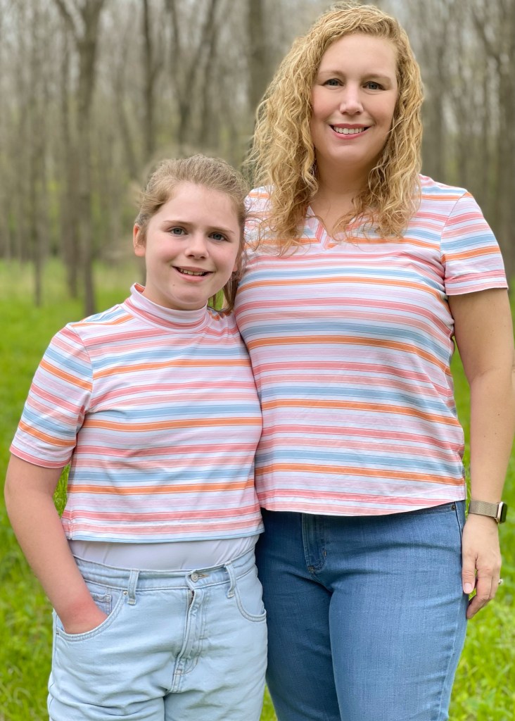 The first makes that I shared was with this great Multi Stripe Print Fabric that our friends at Raspberry Creek Fabrics sent us from their summer line. I intended it for me, but did not mind sharing with Elise a bit. Elise loves crop everything, so I cropped her favorite Arlington pattern. She is wearing it with her Luna Loungewear Tank that she requested a bazillion more of after the sale sewing. I realized that I wear more Classic Tees than anything else. So, if I have a print I like, that is what I make.