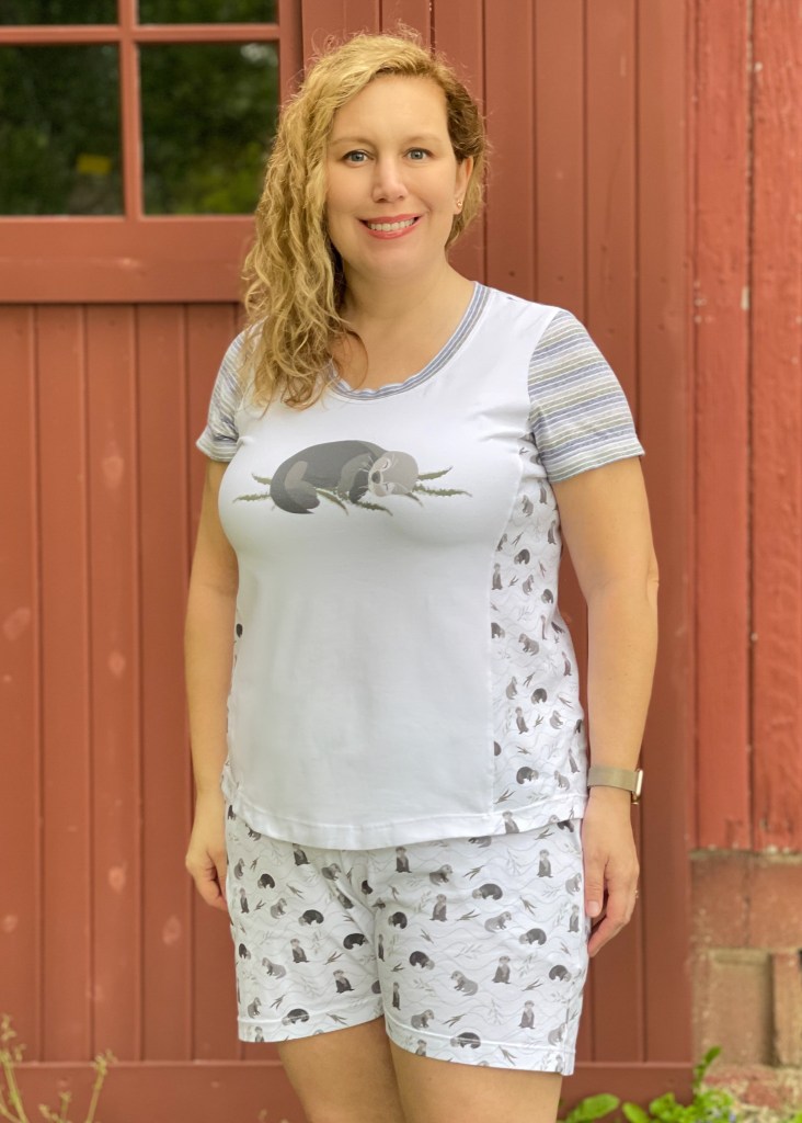 Are you even an Indiana girl, if you haven’t taken pictures by a barn of your new make? I have been wanting to take pictures by this barn by our house for a while, and it was perfect for this new outfit that I also love. Raspberry Creek Fabrics sold this otter print and panel, last winter. Every order, I’d offer to buy them for Elise, but she didn’t want them. So, I finally realized that I wanted them. I have been waiting for the perfect pattern and the Tidal Top is perfectly suited for panels.