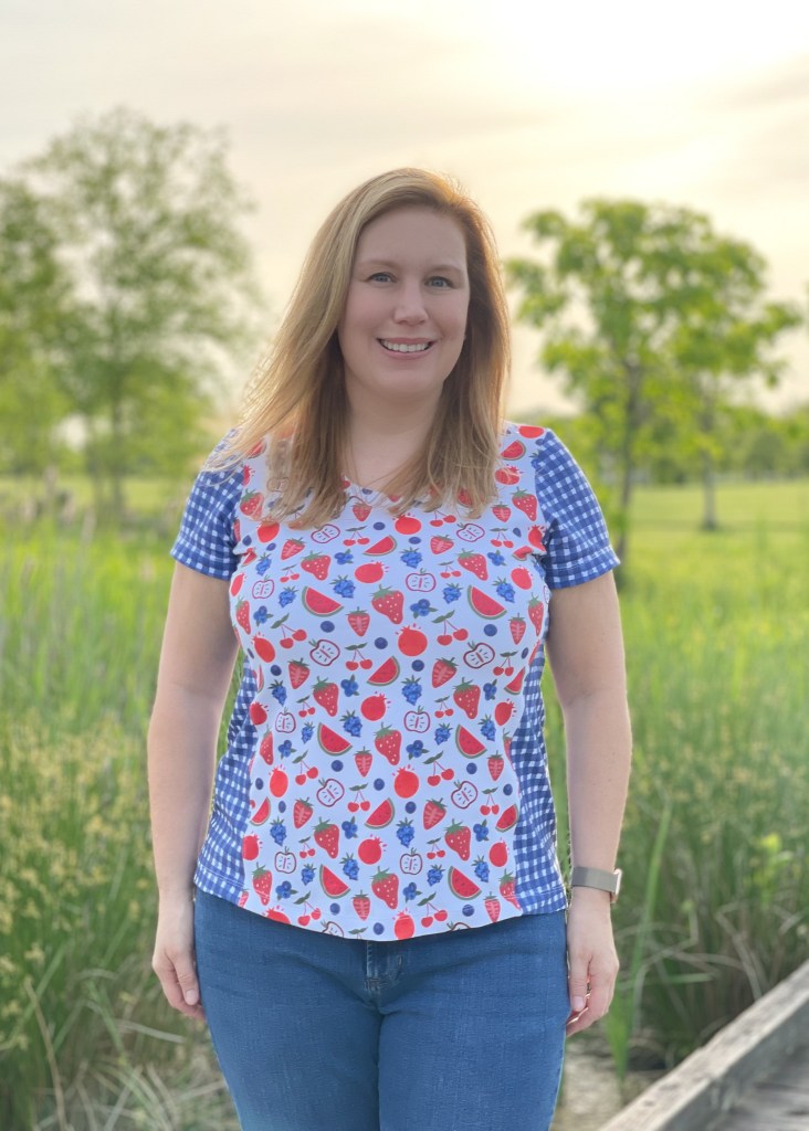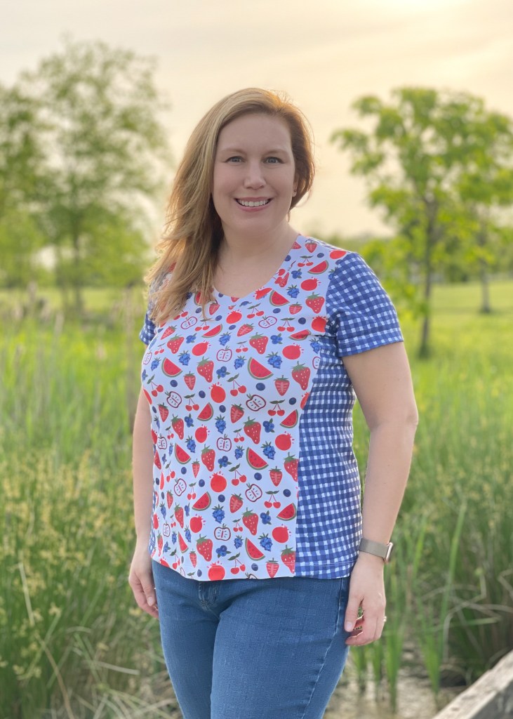 Elise is taking full credit for these photos. She discovered this pond on her school bus ride and had to show me it for photos. I made this Tidal Top with the Tossed Fruit Salad print that I love. A sewing friend made it with Navy Gingham and I had to copy her. This is going to be something I love wearing for Independence Day and all summer.