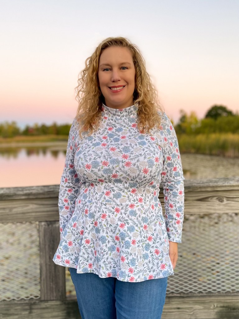 I sewed up this little hack myself and let her see. I knew she’d want a mash of her favorite patterns. All I did was trace the Arlington neckline onto my Margot Peplum pattern. The only issue was the shoulder width. I found it worked best to change the neckline to be closer to the Margot and then just measure a new length for the mock neckband.
