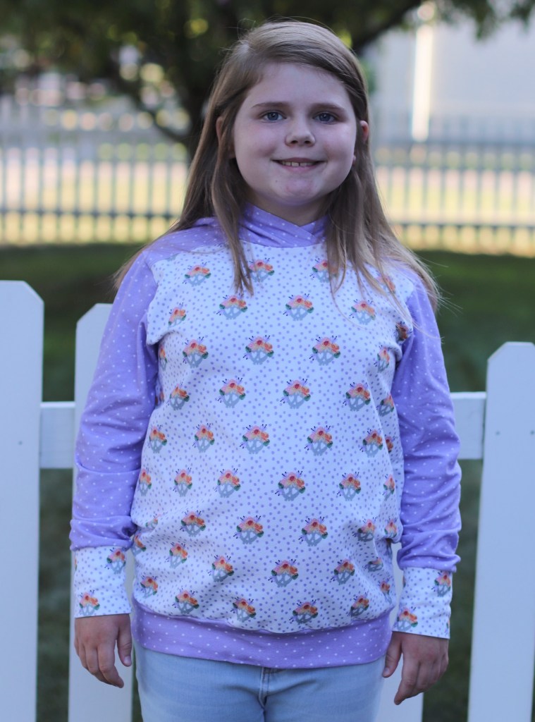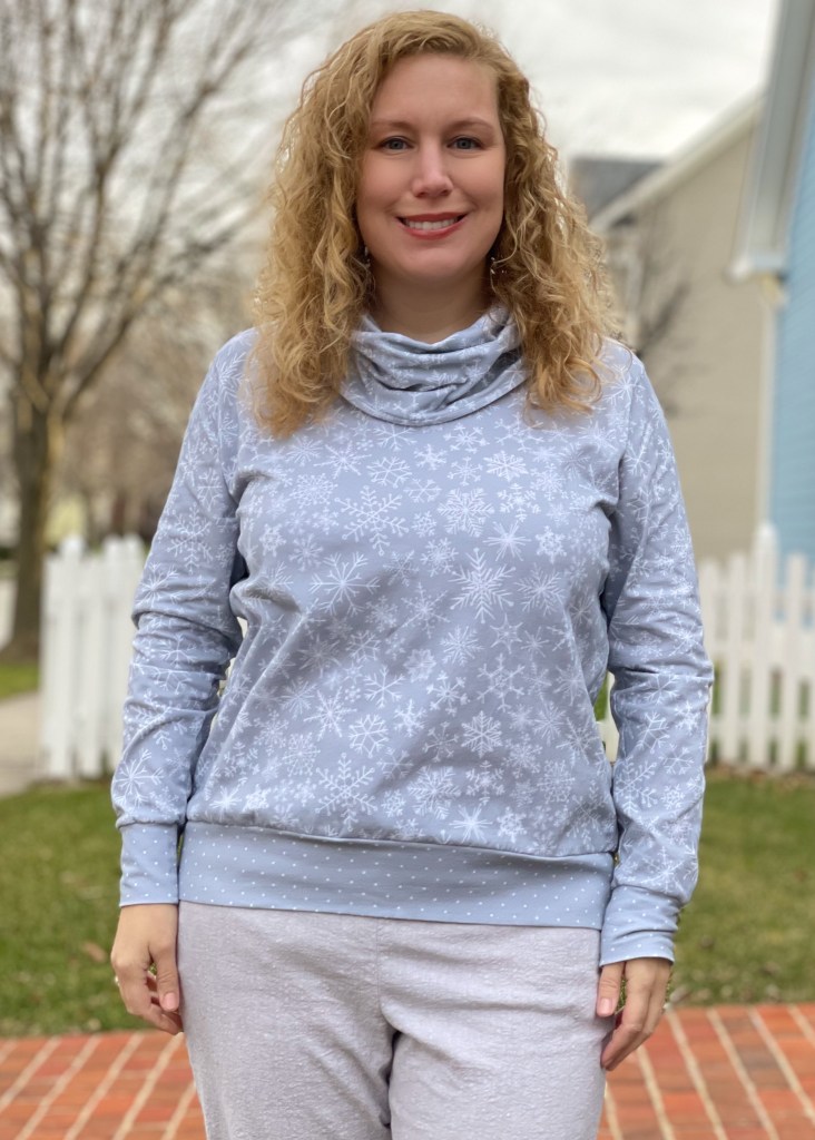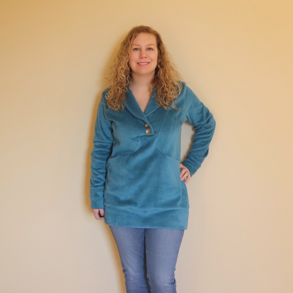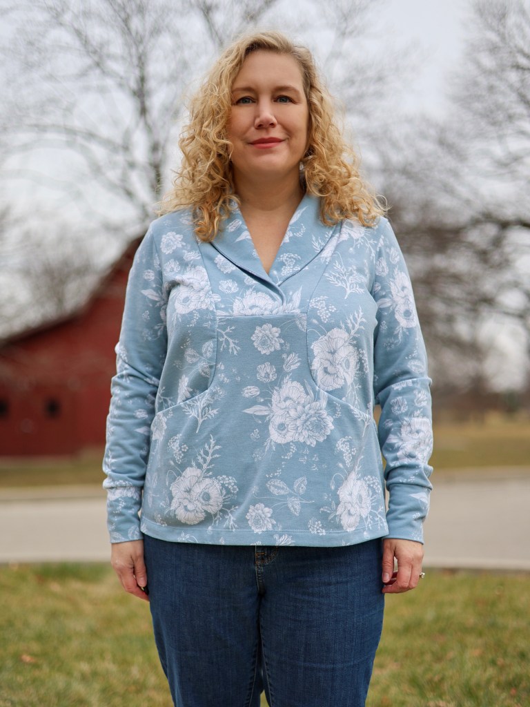 One of the first patterns that I made was the Whistler Pull-Over (and Hoodie). The construction with the pockets looks complicated but is really well explained in the pattern. I made this before I knew to search in YouTube for a video tutorial like I would do today. I made this with sweatshirt fleece with very little stretch that worked well. I love the sweatshirt fleece at Raspberry Creek Fabrics. This a dusty blue heathered floral that they got for this winter. Any fabric that they offer in dusty blue, I will immediately love.