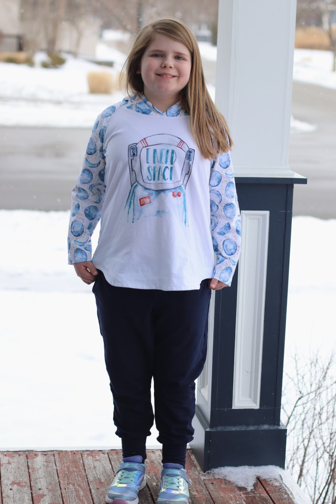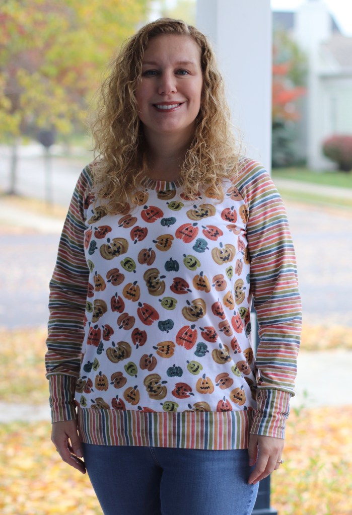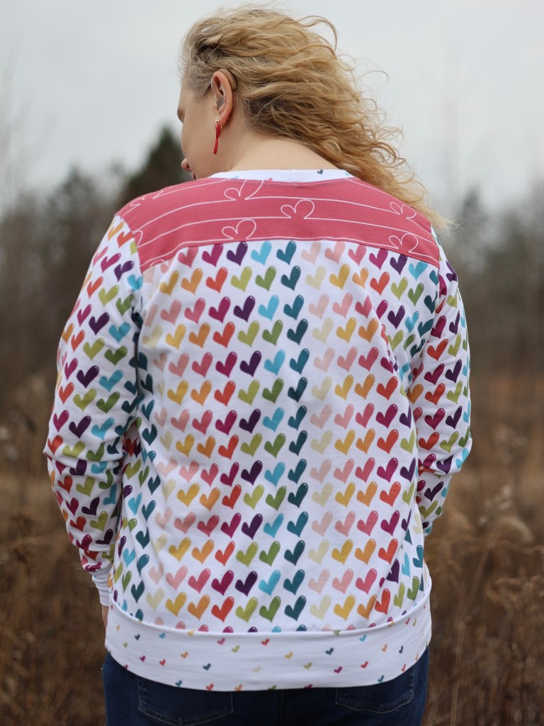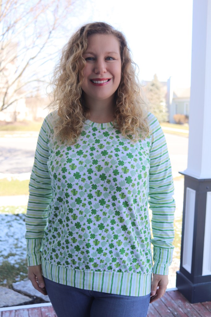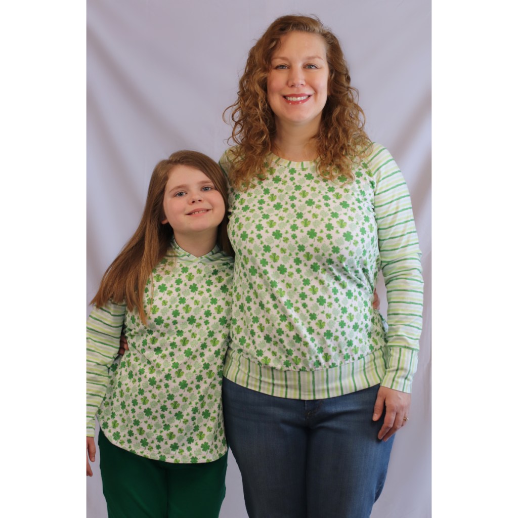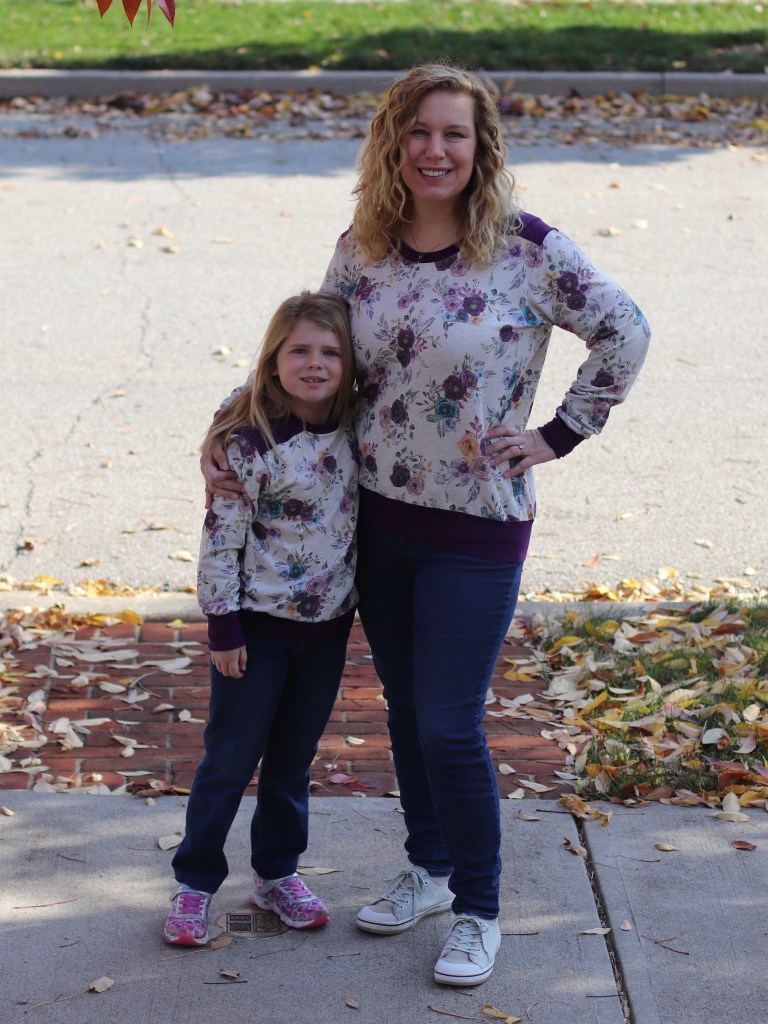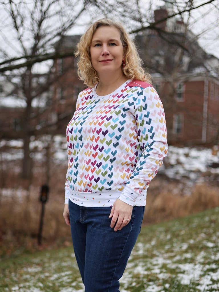 Here is one pattern that I cannot live without. I love the Rockford Raglan so much! It has a girl’s counterpart that has extended sizes called the Wrigley Raglan that Elise liked to wear. I traced over the hem of the Sloane that better matched the curved hem of the Wrigley Raglan to better twin with Elise and now that’s my favorite way to wear it. I used the cute Valentine Fish Kiss collection in rib knit at Raspberry Creek Fabrics to make this. For a long time, I thought cotton Lycra was the way to go, but then I noticed the fabric recommendations was for more flowy fabrics. Now that I’ve tried rib knit and double brushed poly, I love that best.