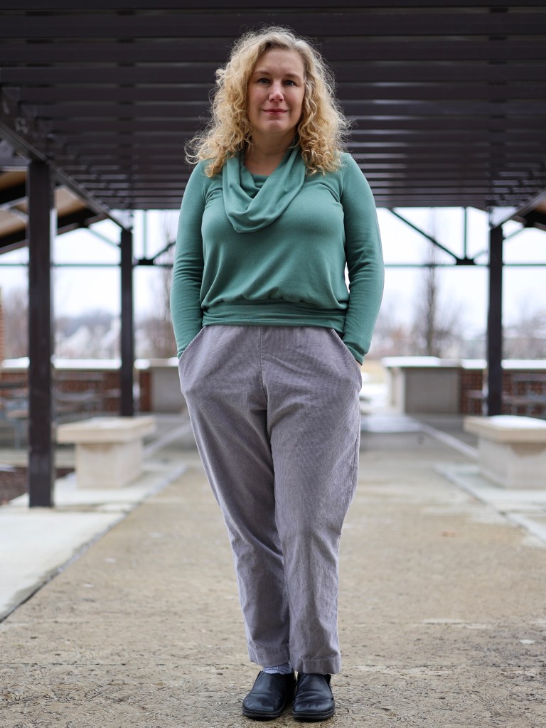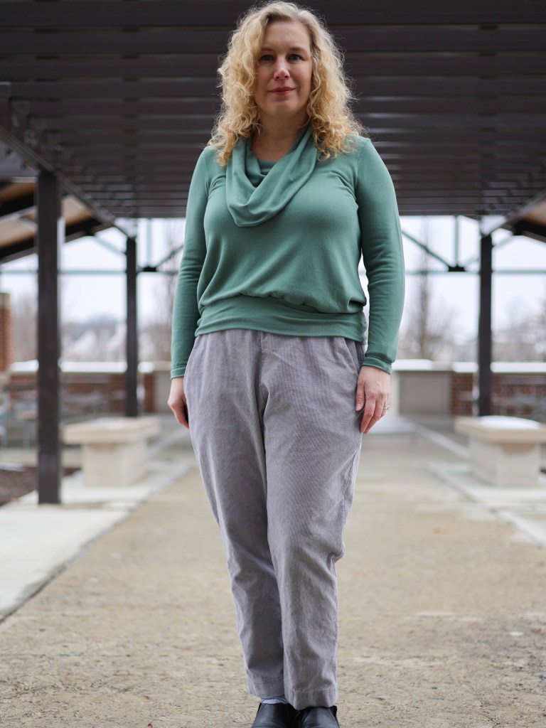 You might be surprised that I didn’t pick the Duet Trousers as my favorite pants pattern, since I’ve done two posts for Love Notions about them. But they do take a while to get the fit just right and I find I have to do this if I lose or gain weight. So, I selected the Allegro Bottoms. It’s relatively easy to get a good fit with these. And in terms of versatility, they are a good companion to the Arlington Sweater. I love the shorts, joggers, and skirt version just as much as I do the slacks version that I’m sharing here in corduroy.