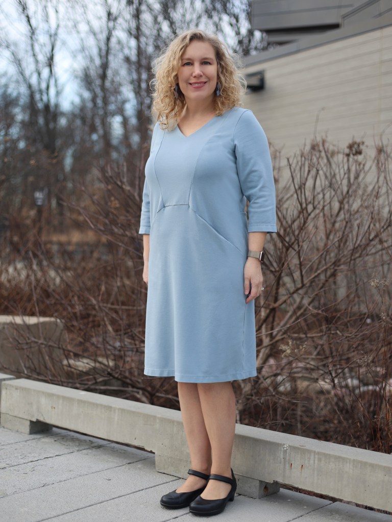 I also wanted to try a version in a solid color to show off all the fun pocket and front details. For this Aurora Dress, I used Surge Fabrics Dusty Chambray Viscose Nylon Ponte.